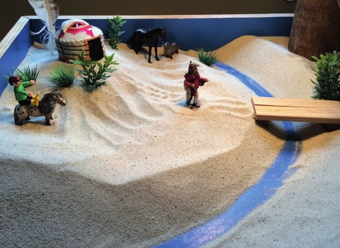Le matériel est constitué de deux bacs à sable (57 x 71 x 7 cm). Un bac est rempli de sable sec, l'autre de sable mouillé. Il y a une grande quantité de figurines miniatures à disposition : personnages, animaux, plantes, maisons, véhicules etc.